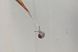 I spotted this baby snail today, hanging off the end of a dangling leaf.
